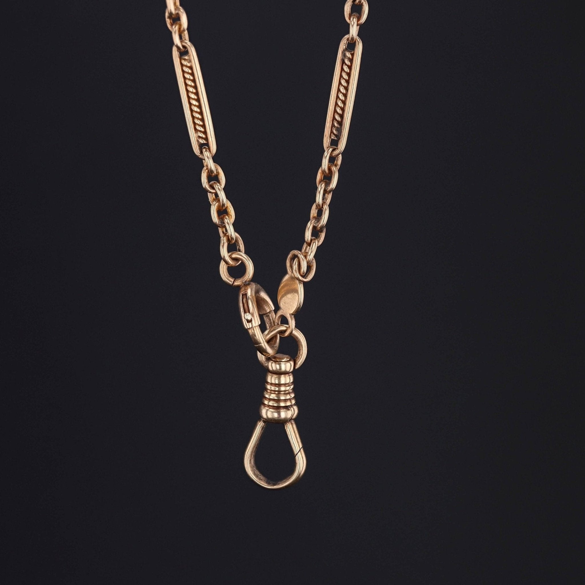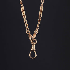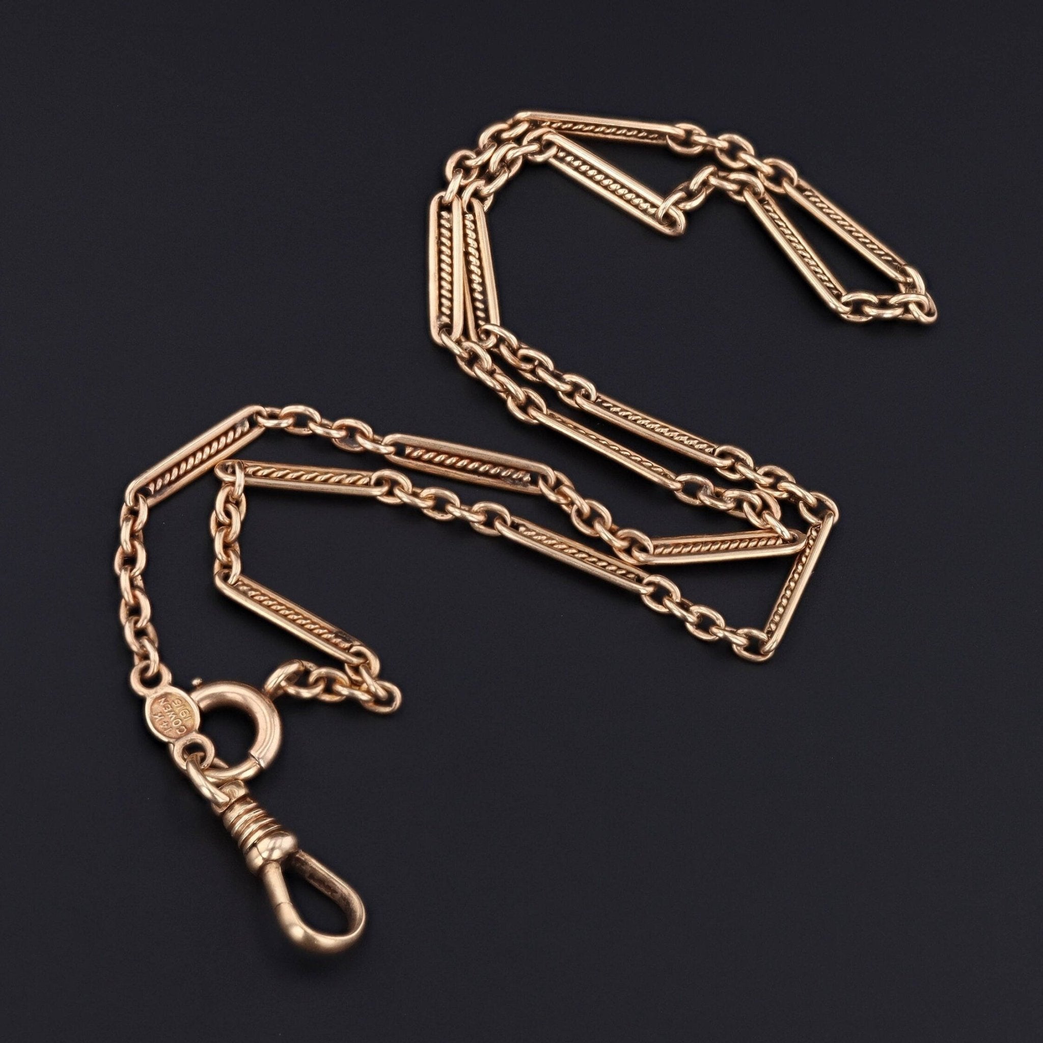 This antique necklace (marked Cowen 1916) is made up of 14k gold and features a dog clasp, ideal for attaching charms, pendants or brooches.