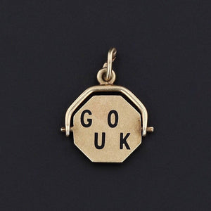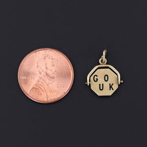 This vintage charm (circa 1950) features a 14k gold disc with enamel letters on either side. When you spin the charm the letters come together and read "Good Luck".