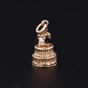 This vintage charm (circa 1950) features a wedding cake that opens to reveal a tiny white baby carriage hidden inside. The charm is unmarked, but acid tests for 14k gold. It is in good condition; however, there is some loss to the enamel on the bride and groom.