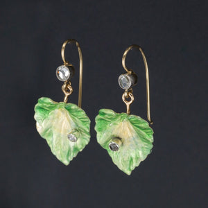 These earrings shimmer with iridescent green enamel leaves with rose cut diamond accents and matching rose cut diamond surmounts. They are 14k gold and in very good condition.