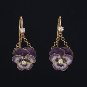 The enamel pansies date to the early 20th century, but the diamond surmount above the flowers is a newer addition. The earrings are in great condition with minimal wear to the enamel visible only under magnification.