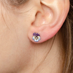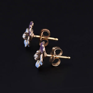 These picturesque earrings (circa 1910) were originally part of an antique brooch transformed into earrings. They are 14k gold with purple and blue enamel and diamond accents at their centers.