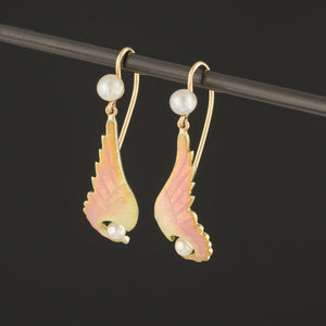 These unique wing earrings were created from an antique pin (circa 1900-1910). The drops feature iridescent peachy pink wings accented with a pearl and they dangle from a matching pearl surmount. The earrings are 14k gold.