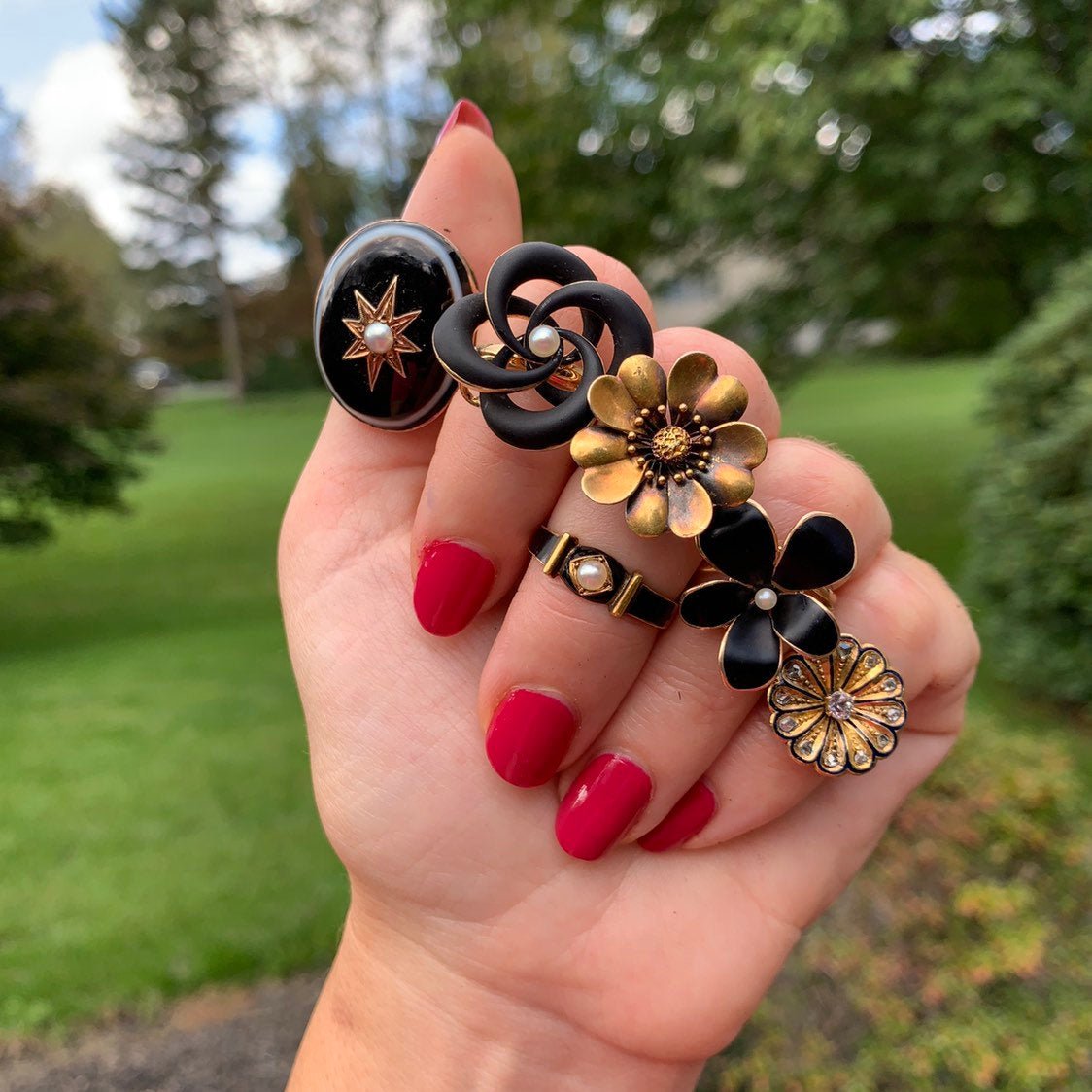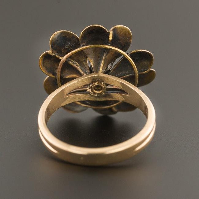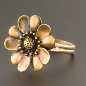 This dramatic bloom was originally a 14k gold antique brooch (circa 1900-1910). Our jeweler transformed the piece by removing the pin findings and welding on a split 14k gold band.
