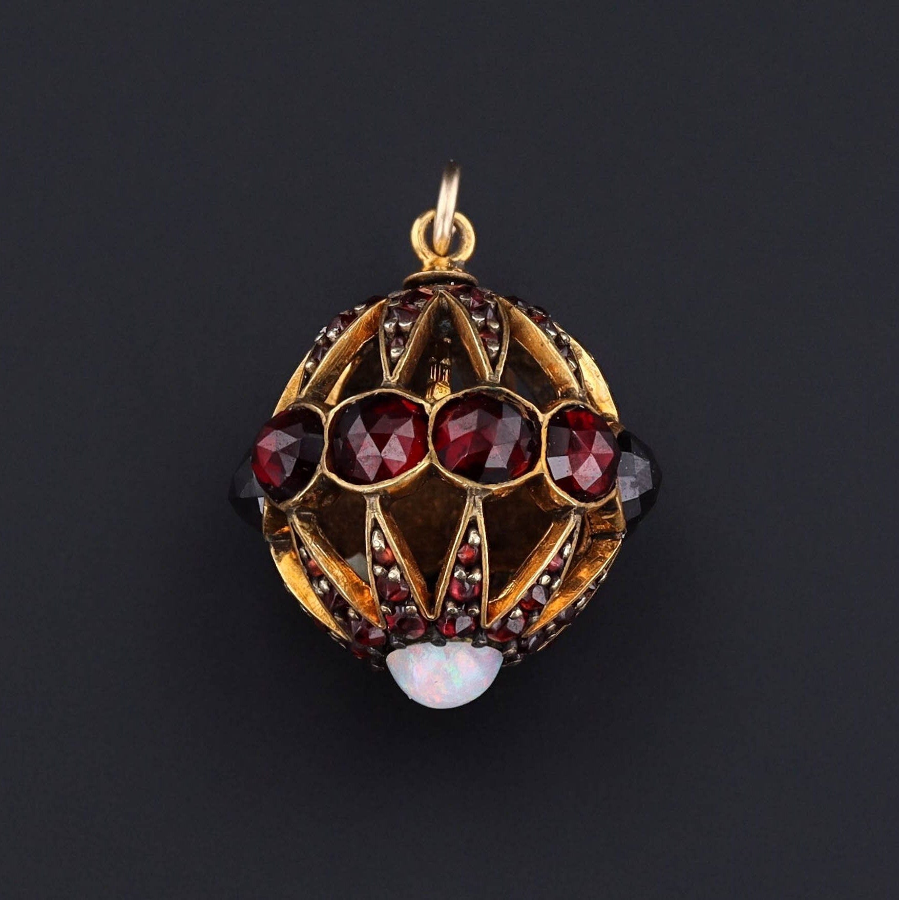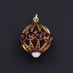 This antique charm features deep red rose cut garnets set in 14k gold with a single opal accenting the base. The pendant was converted to a charm from an antique hat pin (circa 1890-1910).
