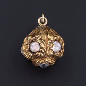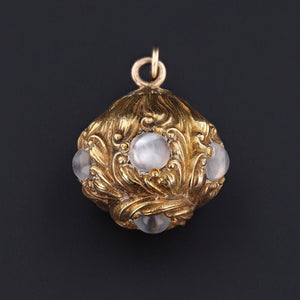 This antique orb pendant (circa 1900-1909) consists of 14k gold and five moonstones around the circumference and one at it's base. The piece was originally an antique hat pin before being converted into a charm.