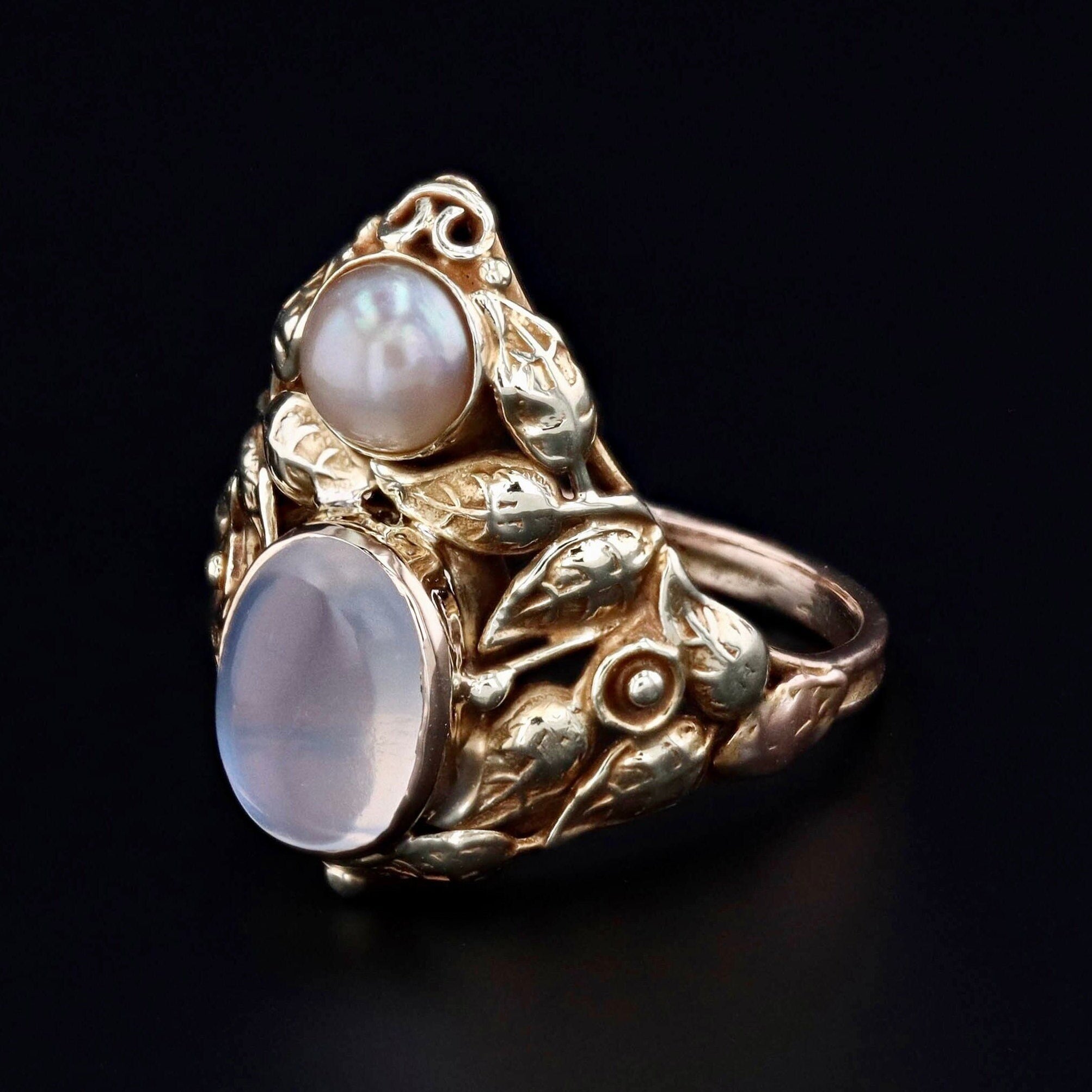 This 14k gold ring from the Arts & Crafts movement of the early 20th century will light up your life! The ring features a domed moonstone cabochon and shimmery pearl embedded in an ornate foliate mounting .