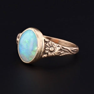This darling opal ring features a fiery opal cabochon with blue undertones and vibrant flashes of green set in an elegant floral mounting that we cast from an antique signet ring. The mounting is 14k gold and features daisies on either side of the band.