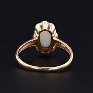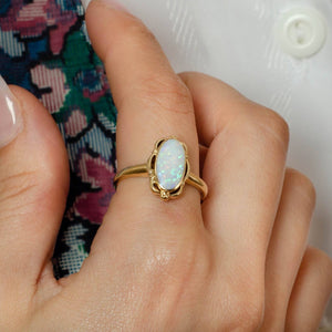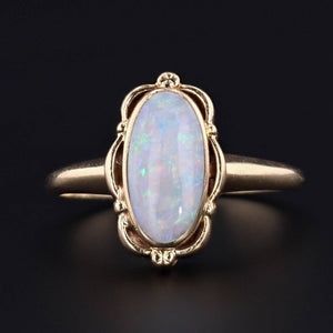 This charming opal ring (circa 1950) features a white oval shaped opal cabochon with subtle flashes of orange and green set in a classic 14k gold mounting.