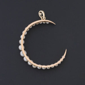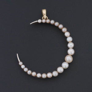 This crescent moon pendant was once an antique brooch (circa 1910). The pendant is accented with lustrous post set pearls of graduated sizes. It is 14k gold with platinum accents on the tips of the crescent.