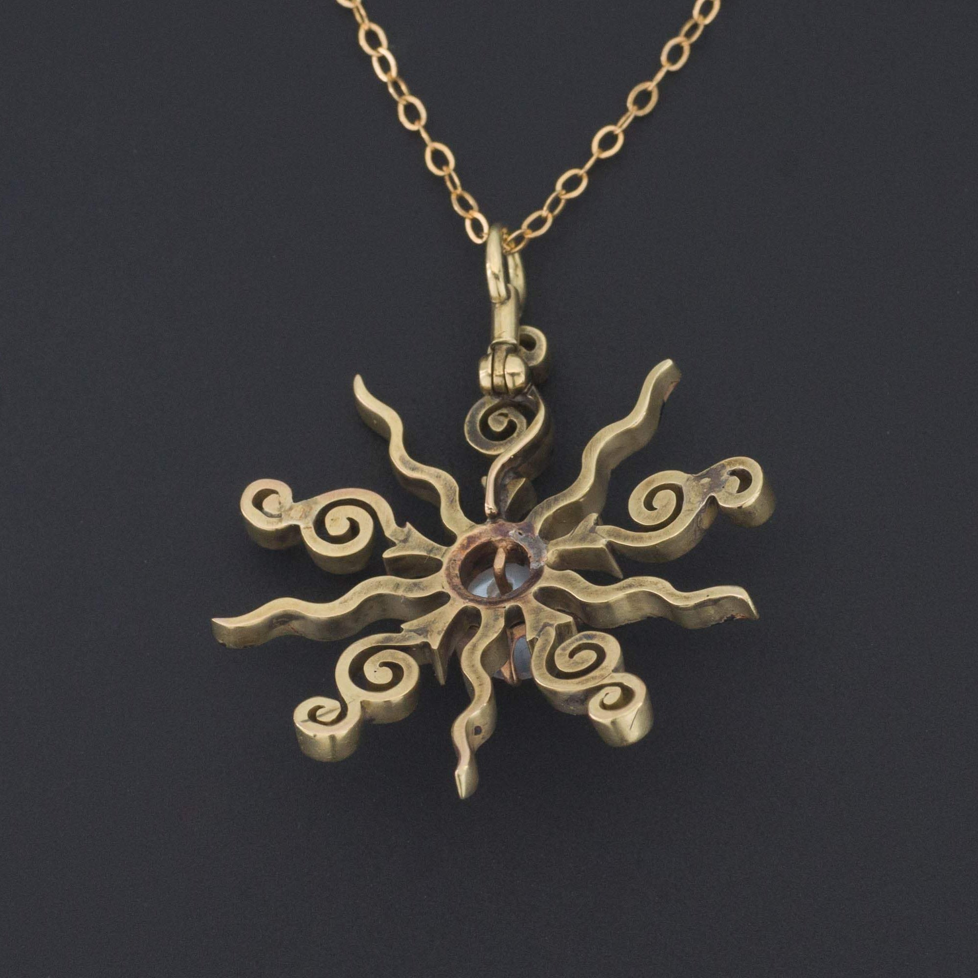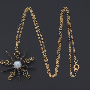 This striking 14k gold moonstone and black enamel pendant was originally an antique brooch (circa 1900-1910). The pin findings were removed at some point in the past and now the piece is a pendant measuring 1.4 inches tall by 1.15 inches wide.