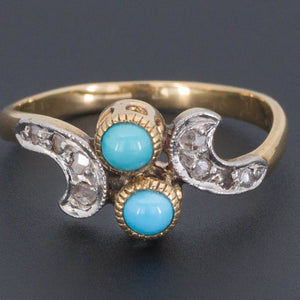 This antique inspired piece dates to the 1970s. It is 14k yellow and white gold with two turquoise and rose cut diamond accents.