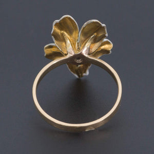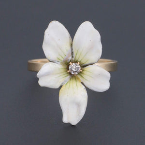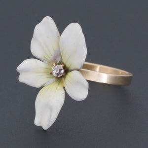 This romantic white violet ring was created from an antique pin (circa 1910). The ring features a 14k gold violet decorated with white enamel and a glistening diamond accent.