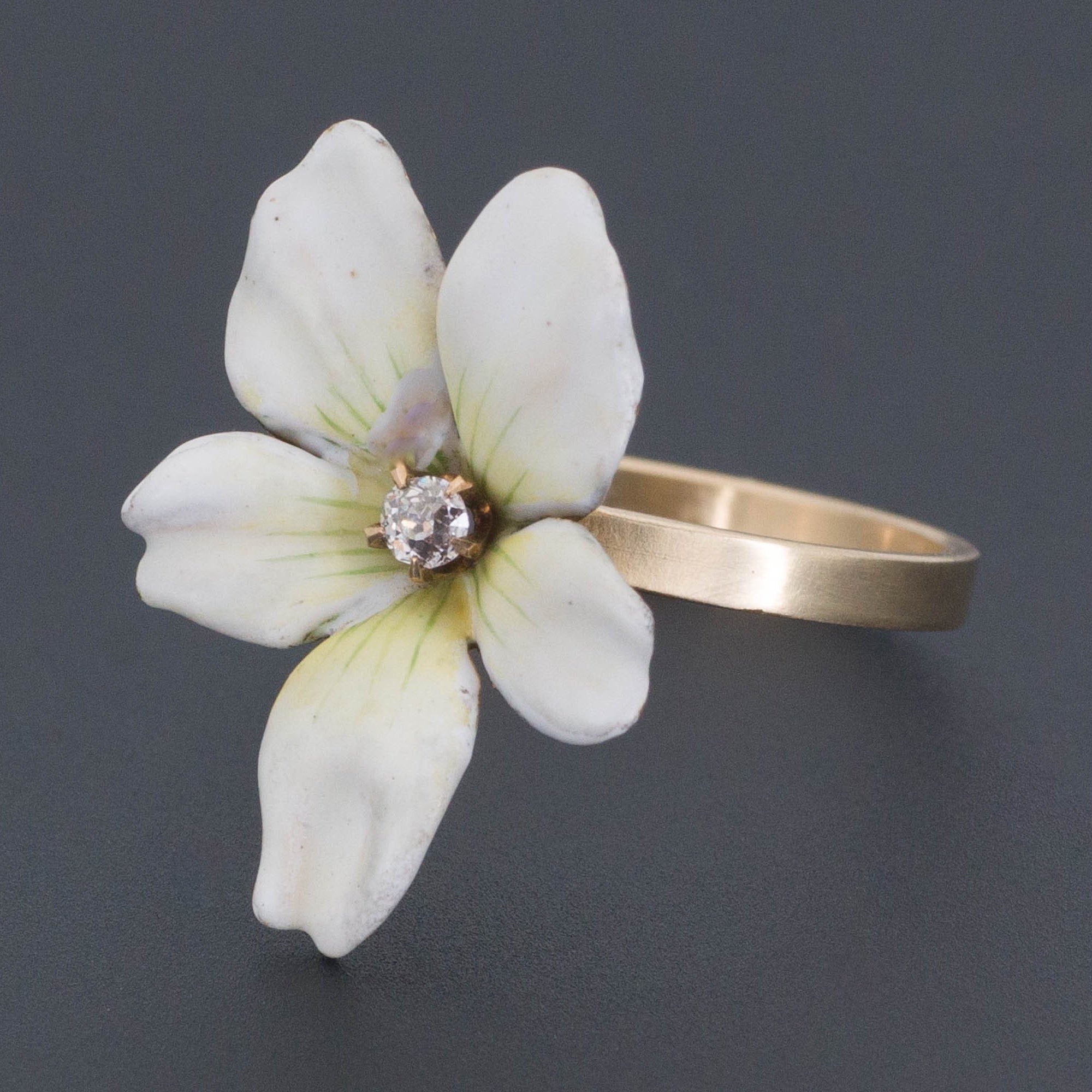 The ring a size 6.5 and in very good condition with a small chip to the enamel on the interior of the flower near the diamond. It can be re-sized free of charge.