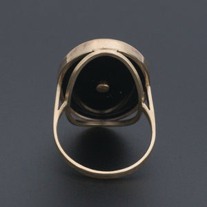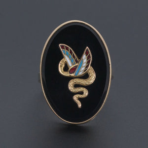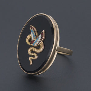 To create this ring, our jeweler removed the enamel winged serpent from an antique pin (circa 1900-1910), riveted it onto a piece of onyx, and built a custom 14k yellow gold mounting.