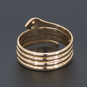 This golden coiled snake features tiny diamond eyes. It is unmarked, but acid tests for 18k gold.