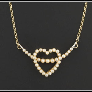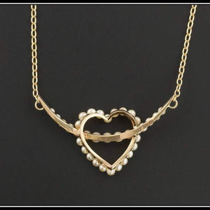To create this piece, our jeweler removed the pin findings from the back of the 14k gold brooch and expertly welded on a vintage 9ct gold chain. The pendant features 35 post set pearls and white gold accents on the tips of the yellow gold crescent moon.