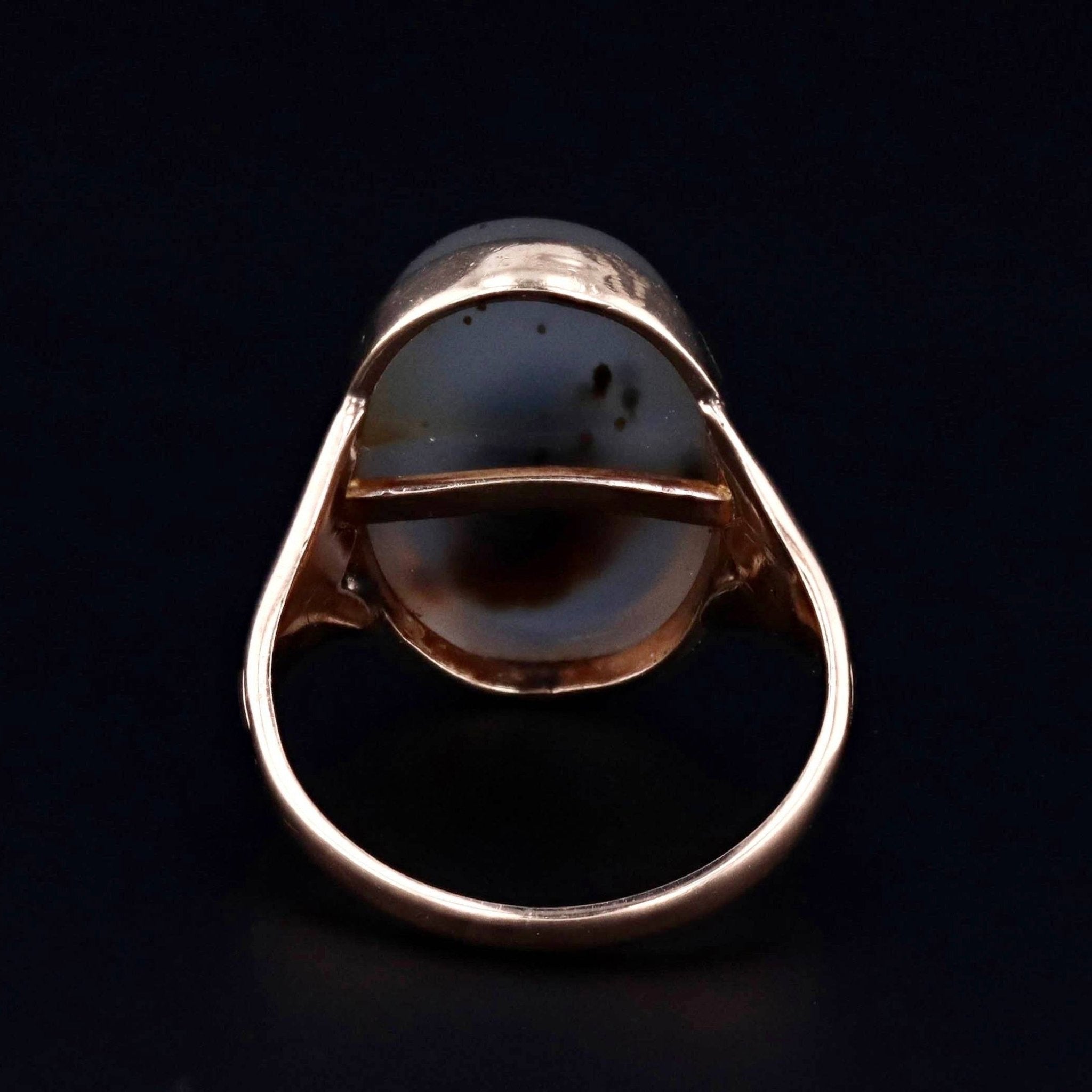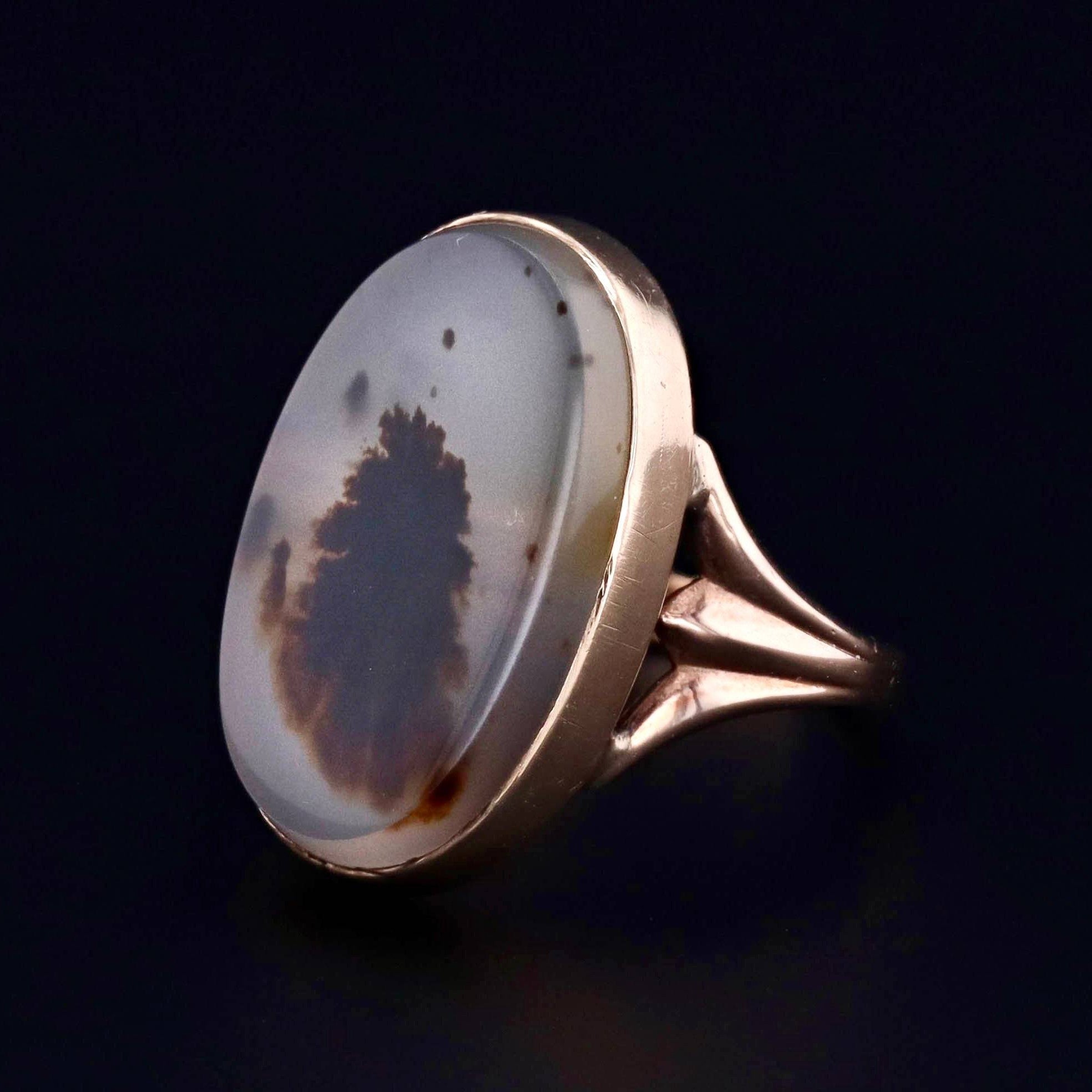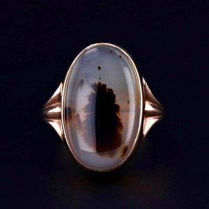 This vintage ring (circa 1960-1980) features an oval agate mounted in 10k gold.
