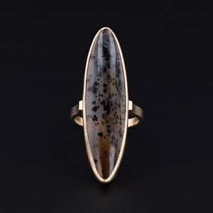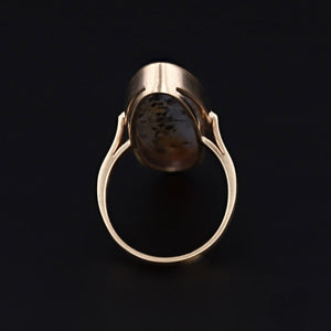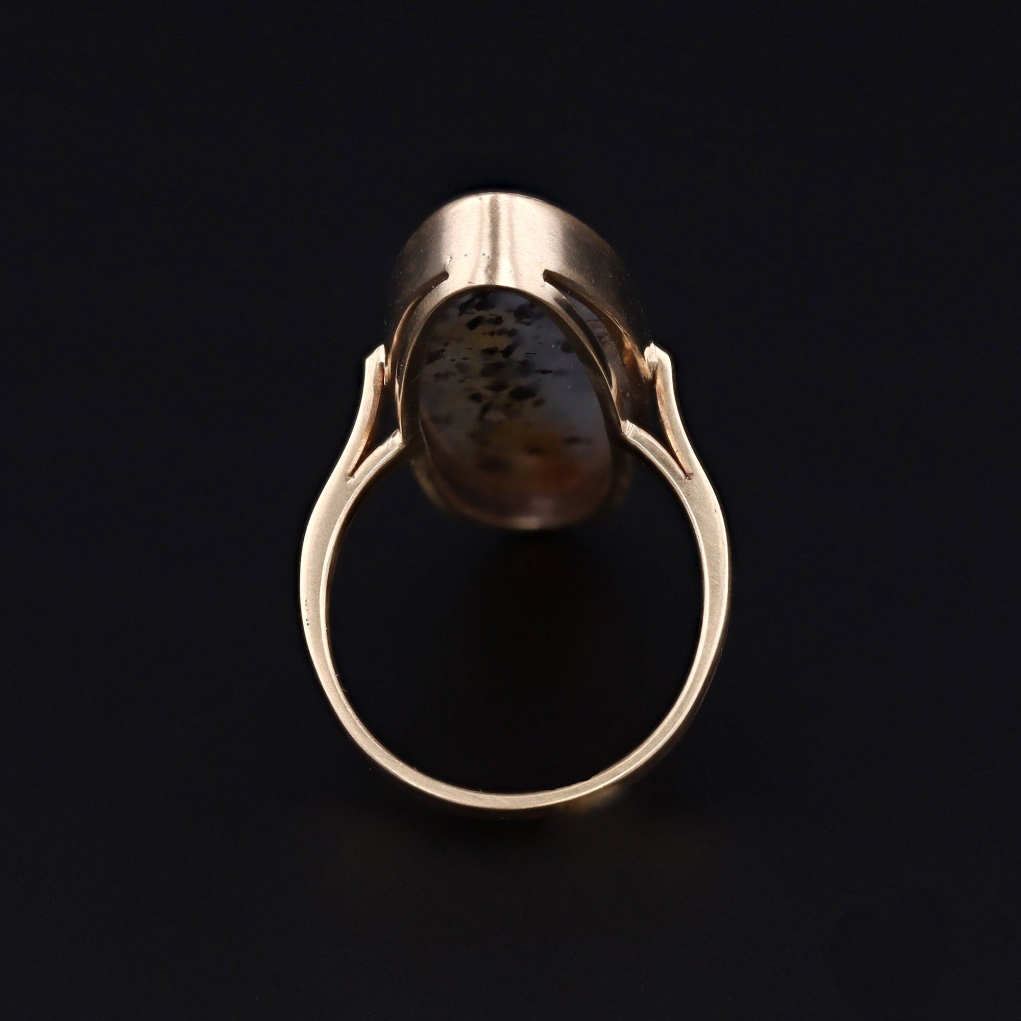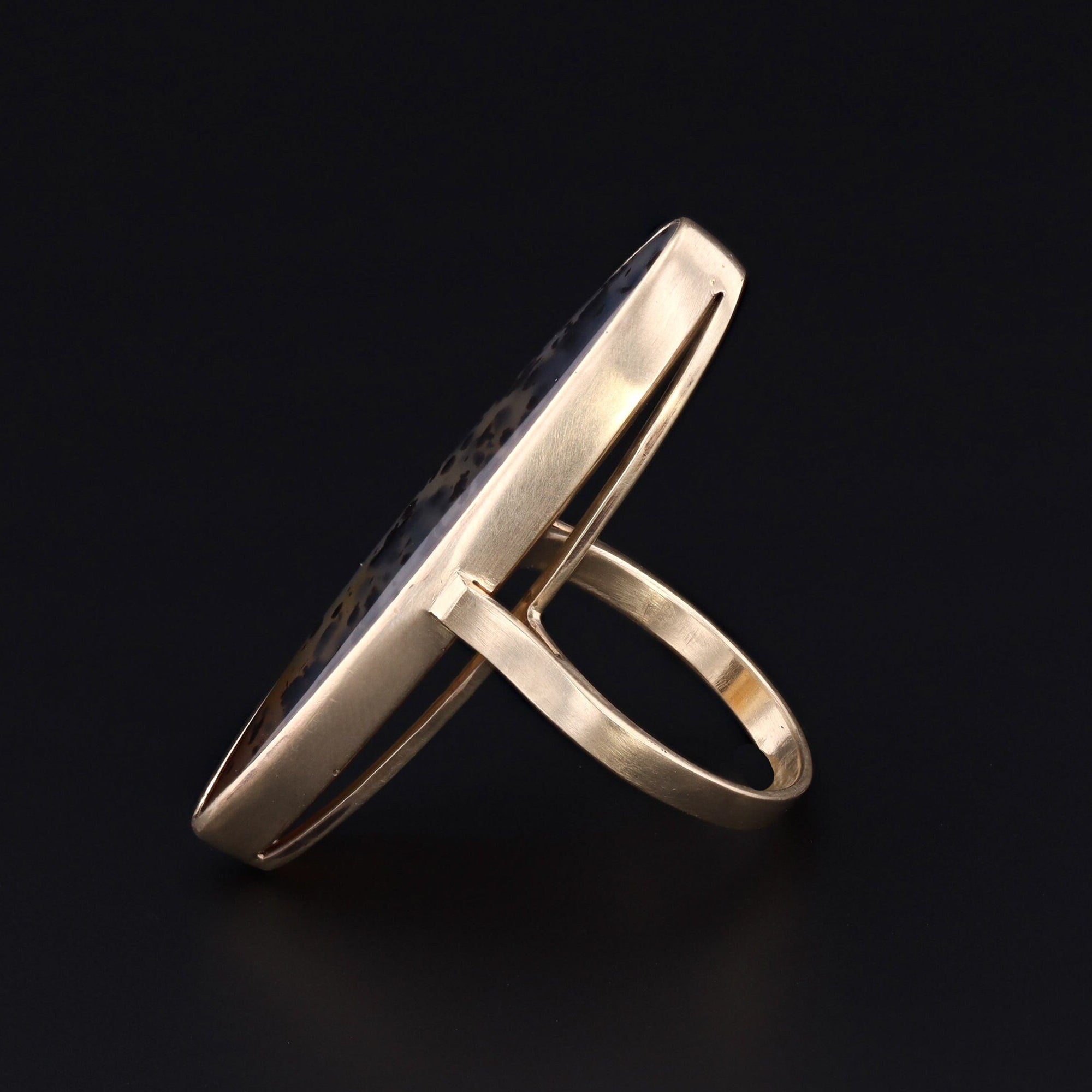 We worked with our jeweler to create this one-of-a-kind ring from a hand selected stone. He built a custom 14k gold mounting for the agate so that it fits quite comfortably on the finger.