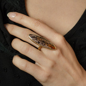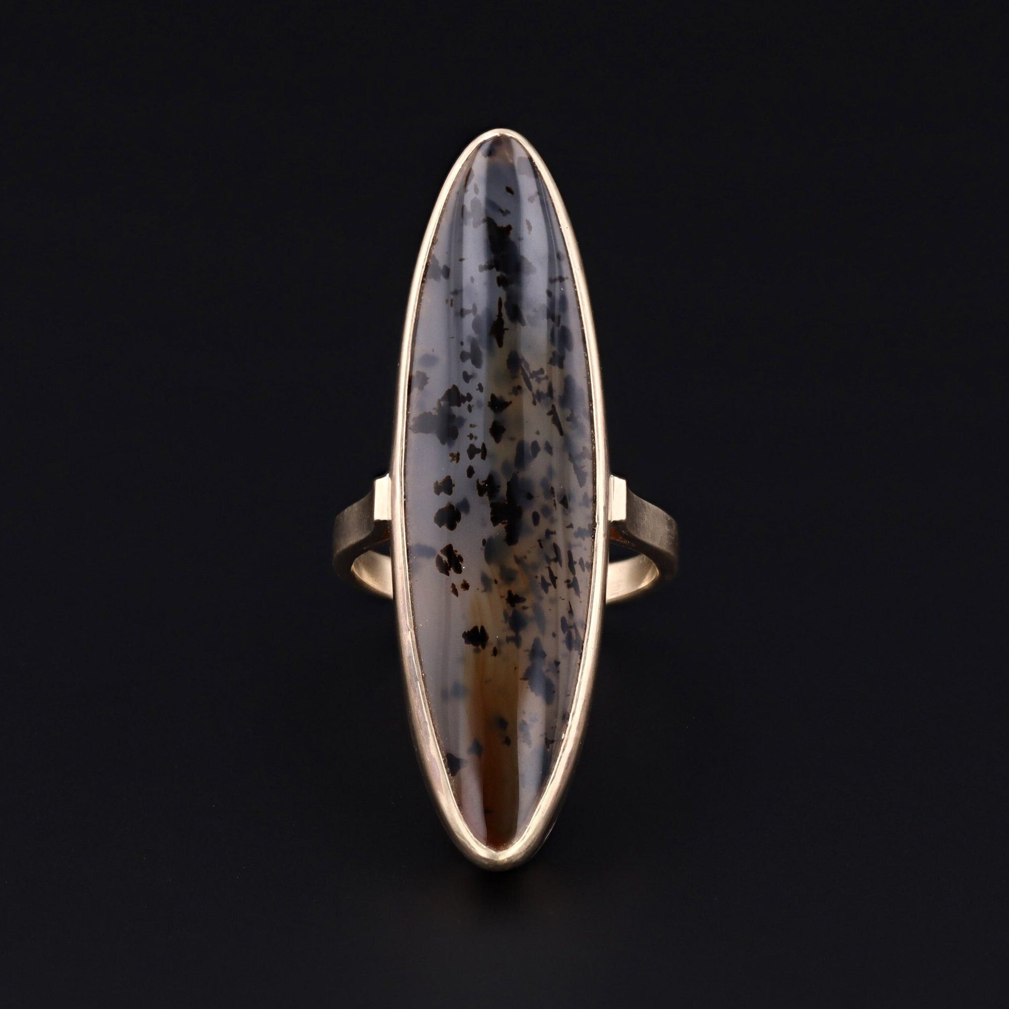 The agate measures 1.6 inches long by 0.45 inches wide and it is in great condition. The ring is currently a size 6, but it can be re-sized free of charge.