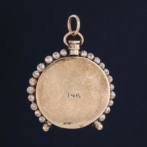 This alarm clock pendant (circa 1950-1960) is marked for 14k gold and features tiny wire strung pearls around the clock.