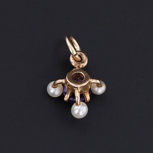 This antique charm was originally an antique stick pin (circa 1900-1910) transformed by removing the pin stem and welding on a gold jump ring bail. The charm features a vibrant purple amethyst cabochon surrounded by four post set pearls.