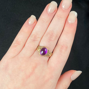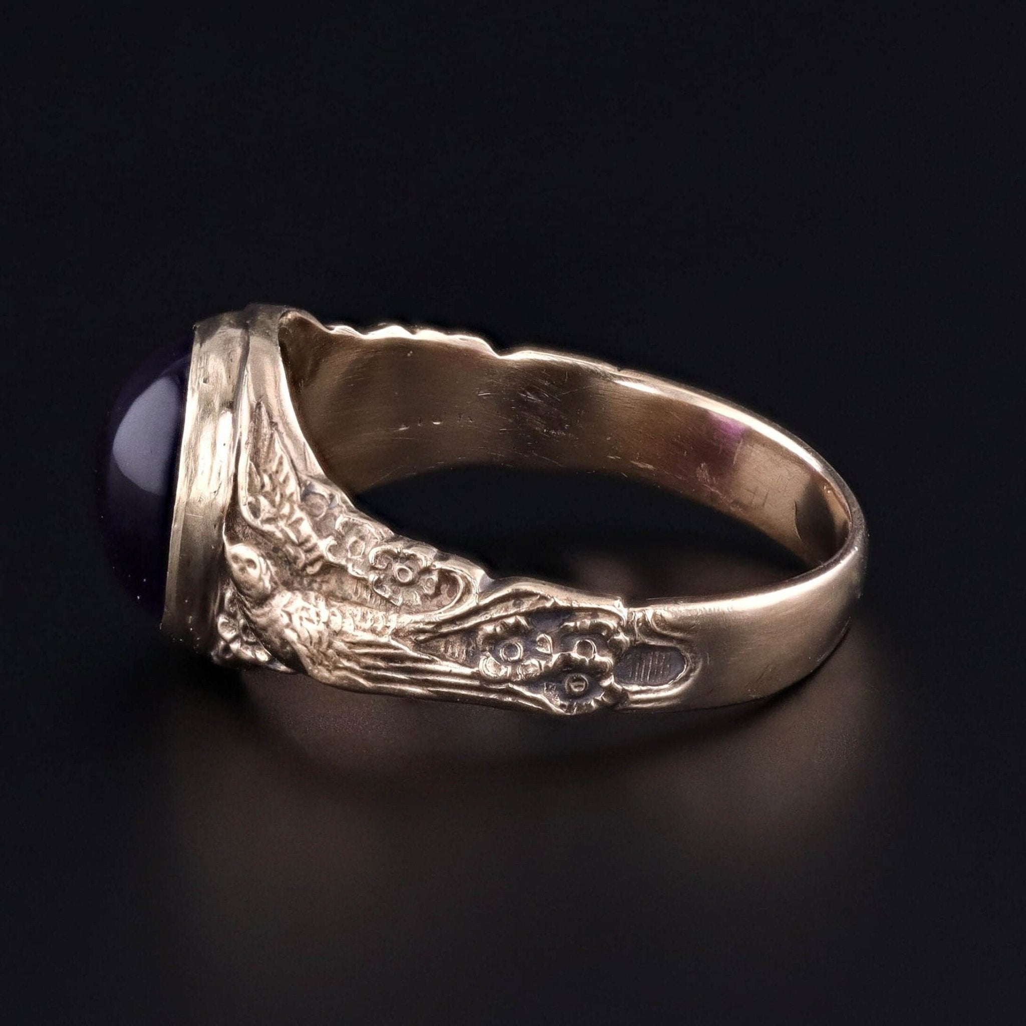 This alluring ring features an amethyst cabochon mounted in an elegant Art Nouveau style mounting that we cast from an antique signet ring. The mounting is 14k gold and features finely detailed birds on either side of the band.
