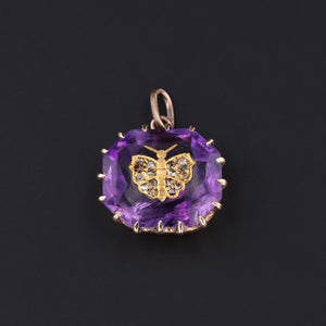 The setting is 14k gold and holds an amethyst inlaid with a glistening diamond butterfly. The pendant measures .06 inches in height and 0.7 inches wide, and it is in great condition.