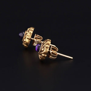 These earrings were converted from antique shirt studs (circa 1910) and feature amethyst cabochons set in decorative 14k gold.
