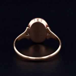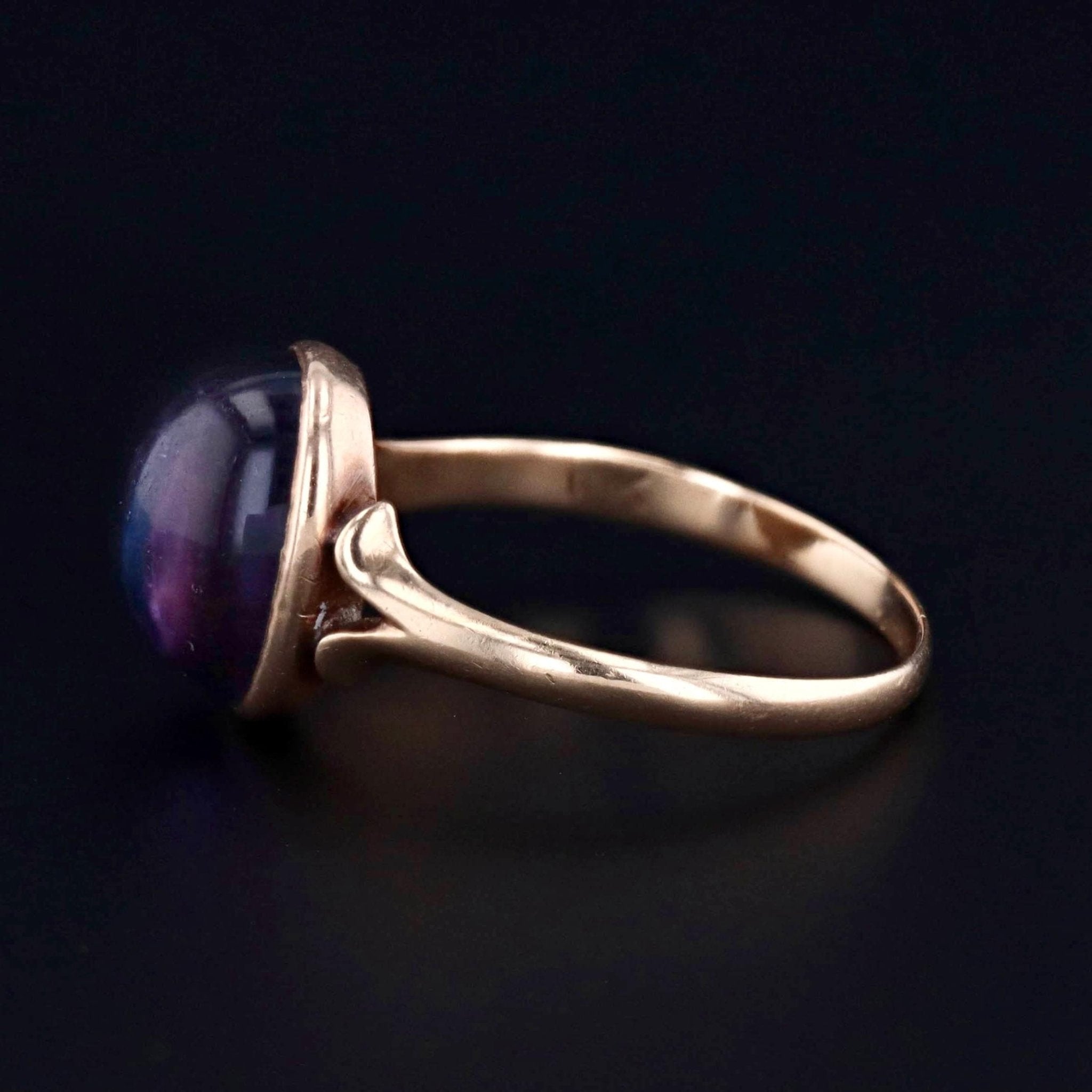 This alluring ring (circa 1930) features a foiled back domed amethyst cabochon mounted in 10k gold.