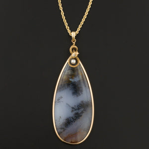 We created this one-of-a-kind piece by mounting the teardrop shaped agate in 14k gold and welding on a coiled serpent with diamond and pearl accents on the top. The serpent was originally an antique stick pin (circa 1890-1910).