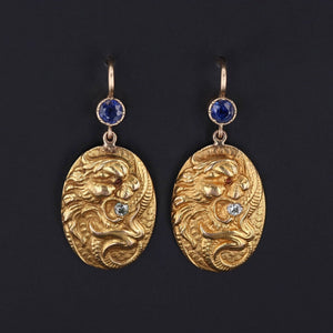These elegant dangles were created from antique 14k gold cufflinks (circa 1900-1910). The earrings feature dragons with tiny garnet eyes and diamonds in their teeth, and our jeweler added sapphire surmounts and new 14k gold ear wires. The reverse of the cufflinks is engraved "E.O.S. to Aunt Ella Sweper."
