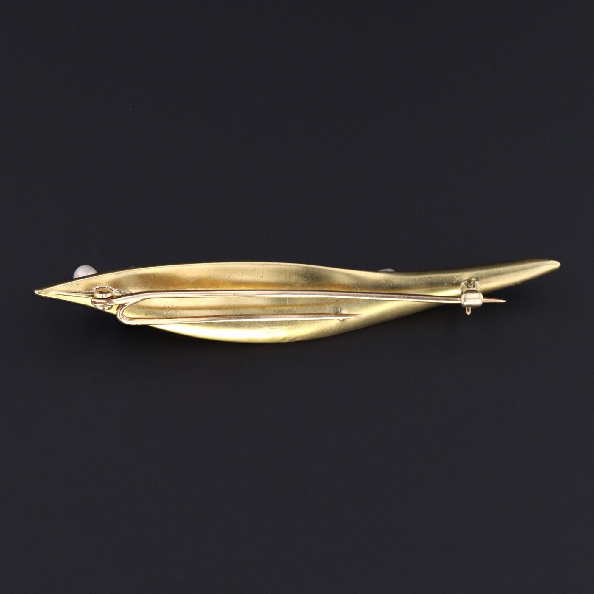 The brooch measures 2.55 inches from top to bottom by 0.4 inches wide. It is in excellent condition and weighs 9.5 grams.