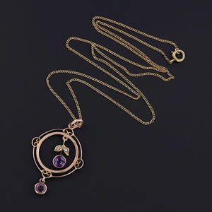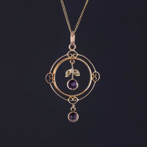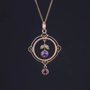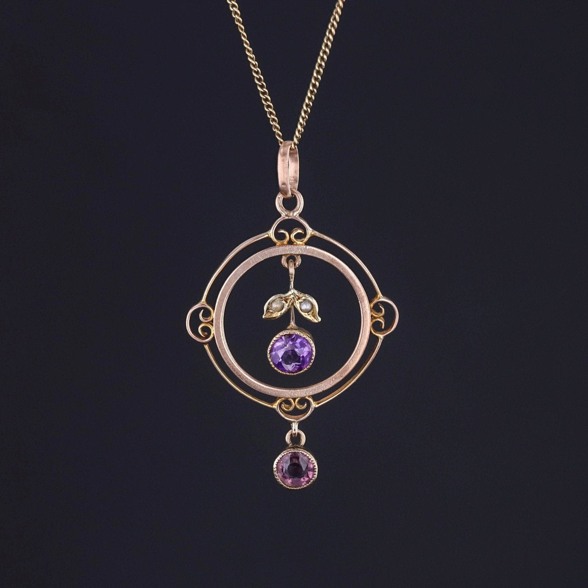 This antique 9ct gold lavalier pendant (circa 1900) features an amethyst and pearl dangle at its center and a matching purple glass accent dangling below.