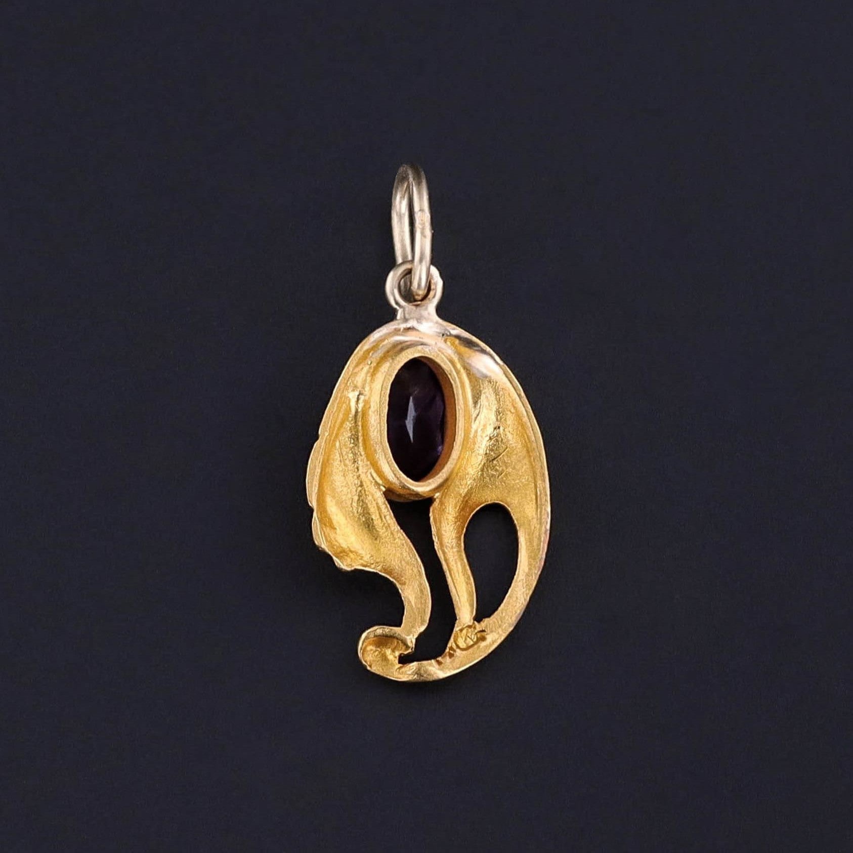 This charm features a deep purple amethyst set in flourishing 14k gold. It was originally an antique stickpin (circa 1910) that our jeweler transformed by removing the pin and adding a 14k gold jump ring bail.