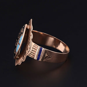 The ring is currently a size 9.5 and can be re-sized free of charge. It is in good condition with some minor wear to the enamel visible under magnification.