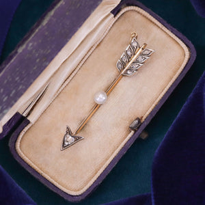 This striking antique pendant began its life as a brooch from circa 1900–1910, thoughtfully converted by removing the original pin and adding a jump ring bail for modern wear. The design features a finely crafted arrow in solid 14k gold, accented with rose cut diamonds and a single lustrous pearl—a timeless symbol of love and direction.
