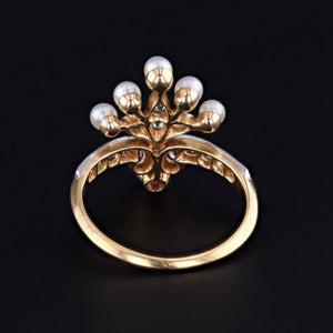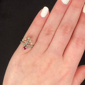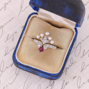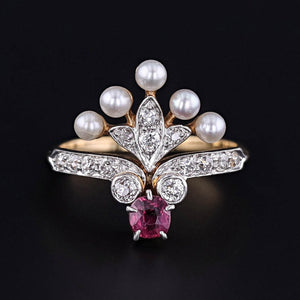 This Belle Epoque era, antique ring (circa 1890-1900) features a plume of old European cut diamonds, post set pearls, and a 0.234ct natural ruby of a vivid purplish red color. The ring is platinum topped 18k gold.