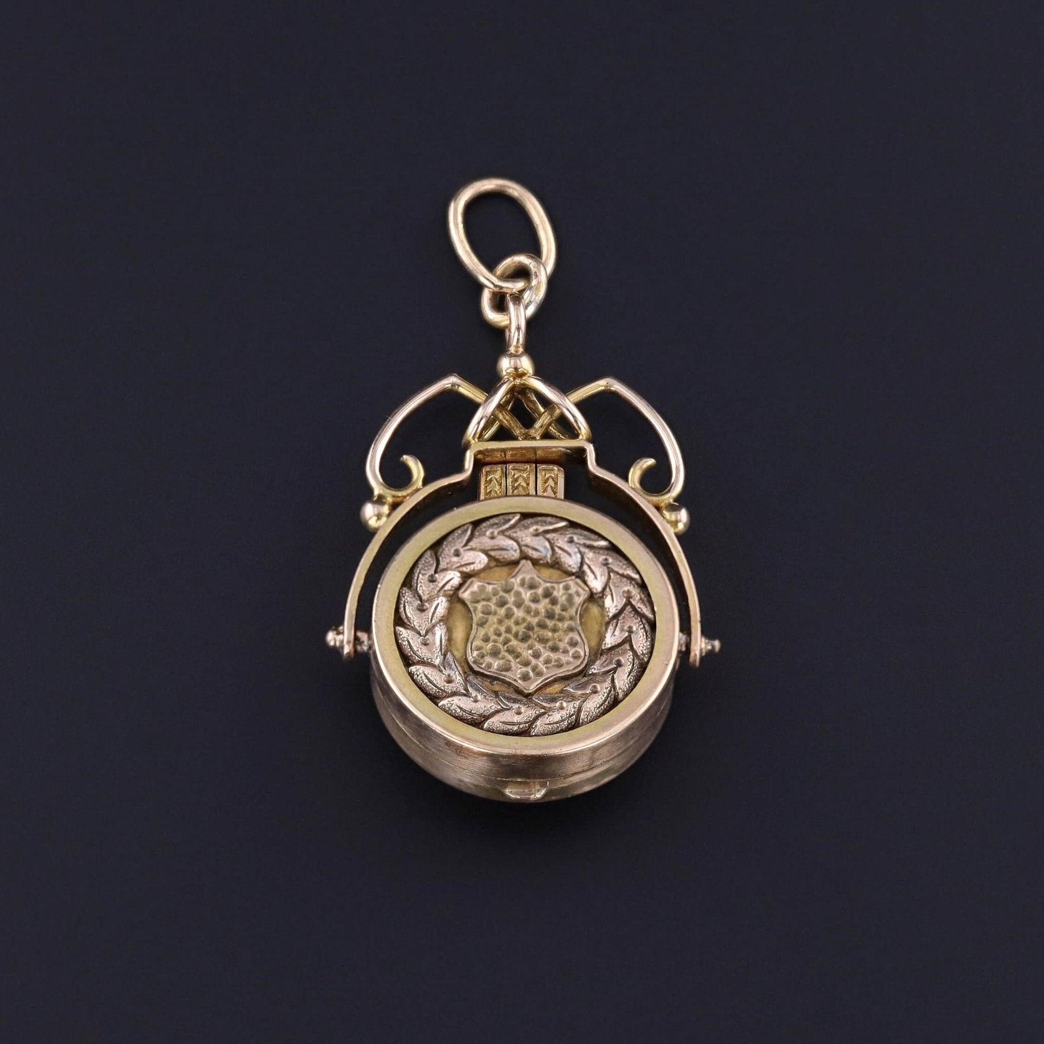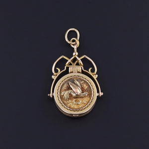 This antique pendant (circa 1890) features a locket of 14k gold with a bird on one side and a shield on the other.