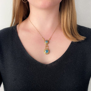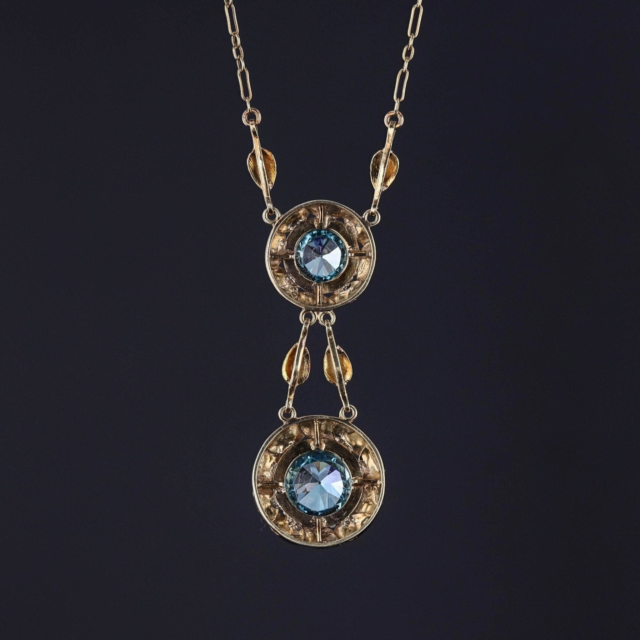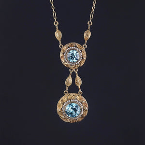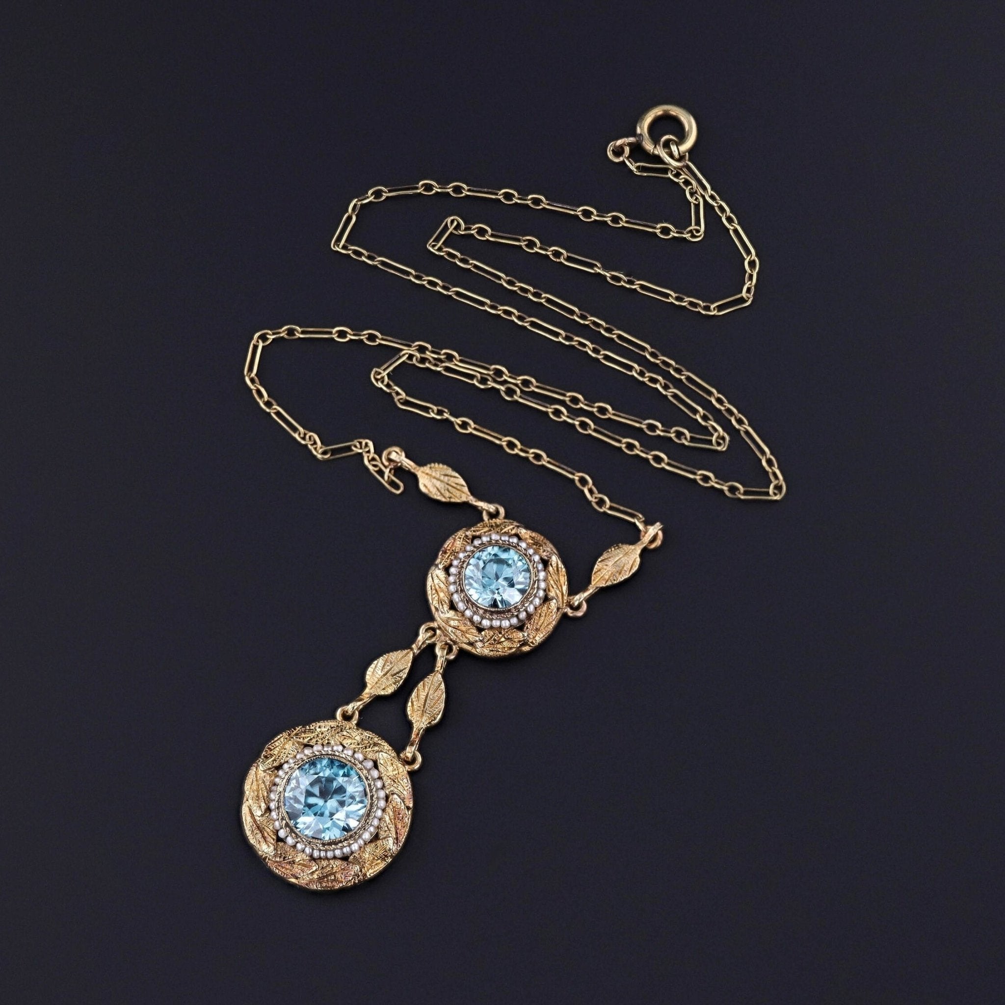 Admire the timeless elegance of this Victorian necklace dating back to 1880, boasting two mesmerizing, round, natural blue zircon stones, approximately 2.75 carats and 1.75 carats. Delicately surrounded by hand-strung natural seed pearls and adorned with hand-set gold leaves, forming a graceful garland design around each stone. Embrace the heavenly allure of this exquisite piece, perfect for adding a touch of vintage sophistication to any ensemble.