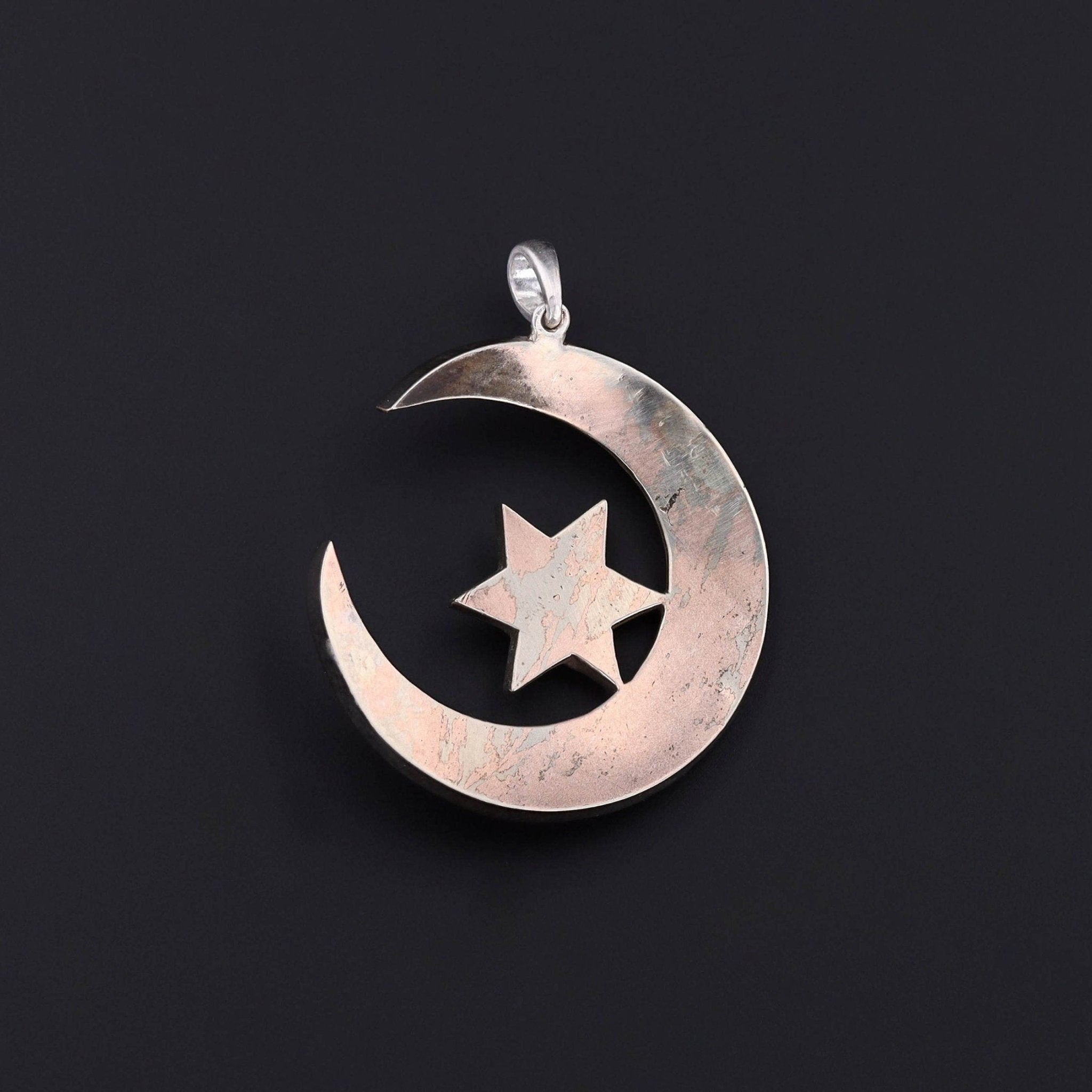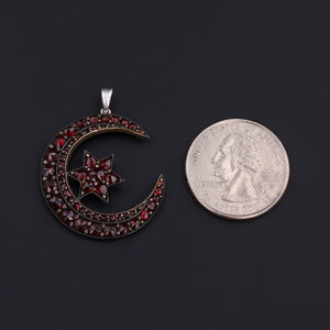 This pendant features a crescent and star of Bohemian garnets in silver with a bit of a worn gold vermeil.