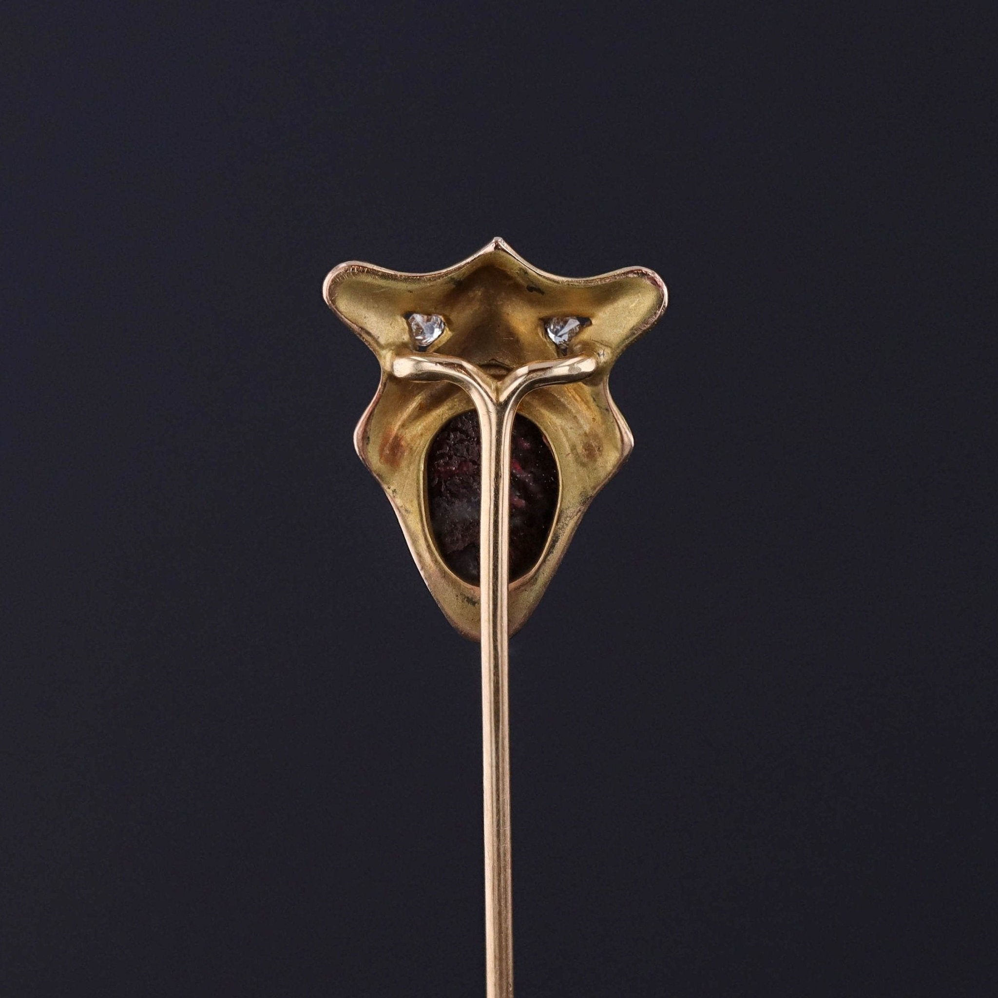 This antique stick pin (circa 1900-1910) features a gargoyle of 14k gold with diamond eyes and a stunning boulder opal in its jaws.