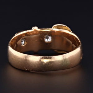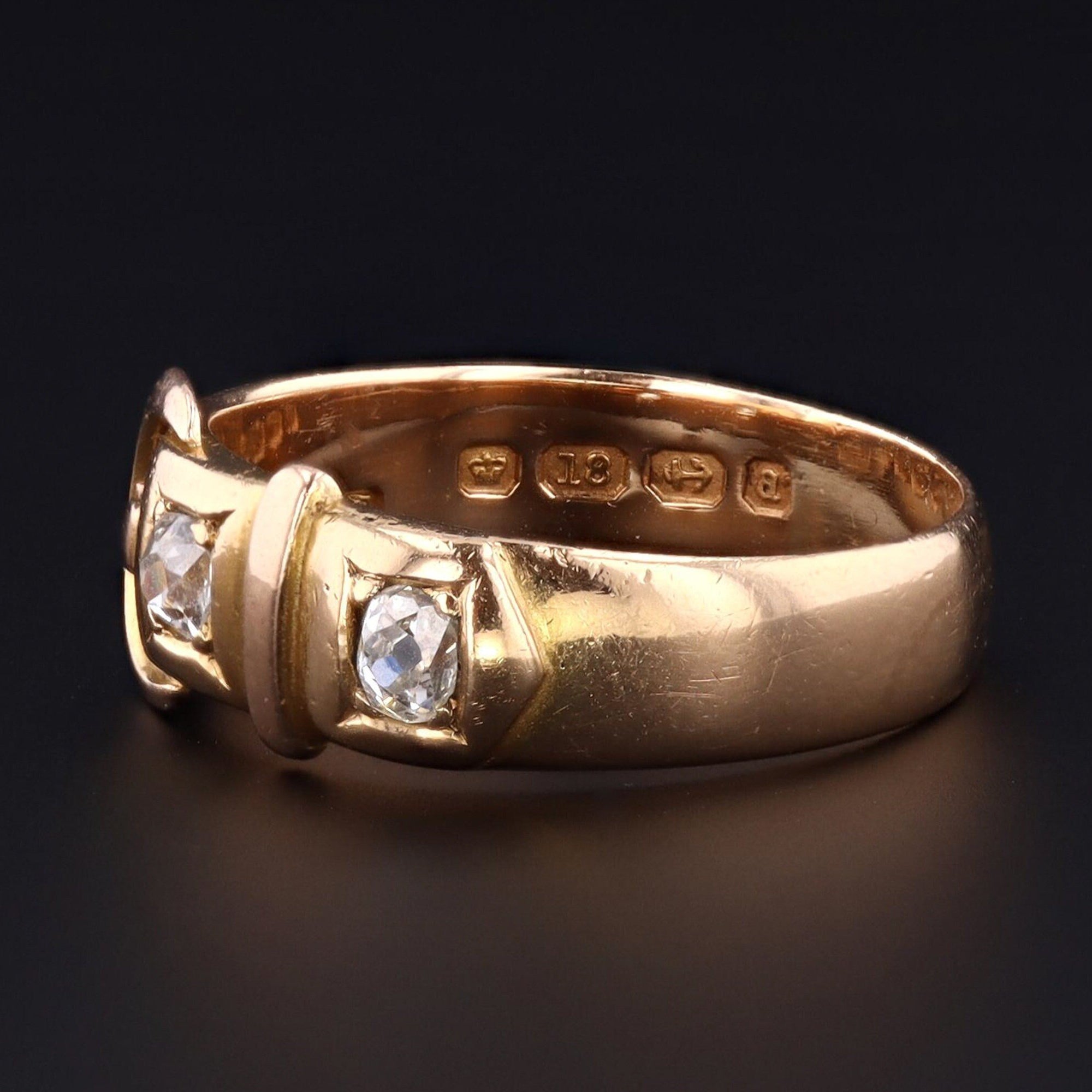 This timeless antique 18k gold buckle ring glistens with two chunky old mine cut diamonds. The ring bears hallmarks indicating that it was assayed in Birmingham England in 1875.