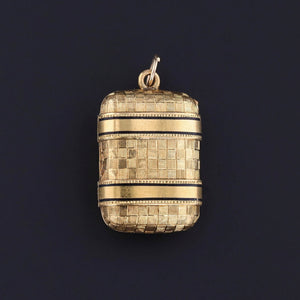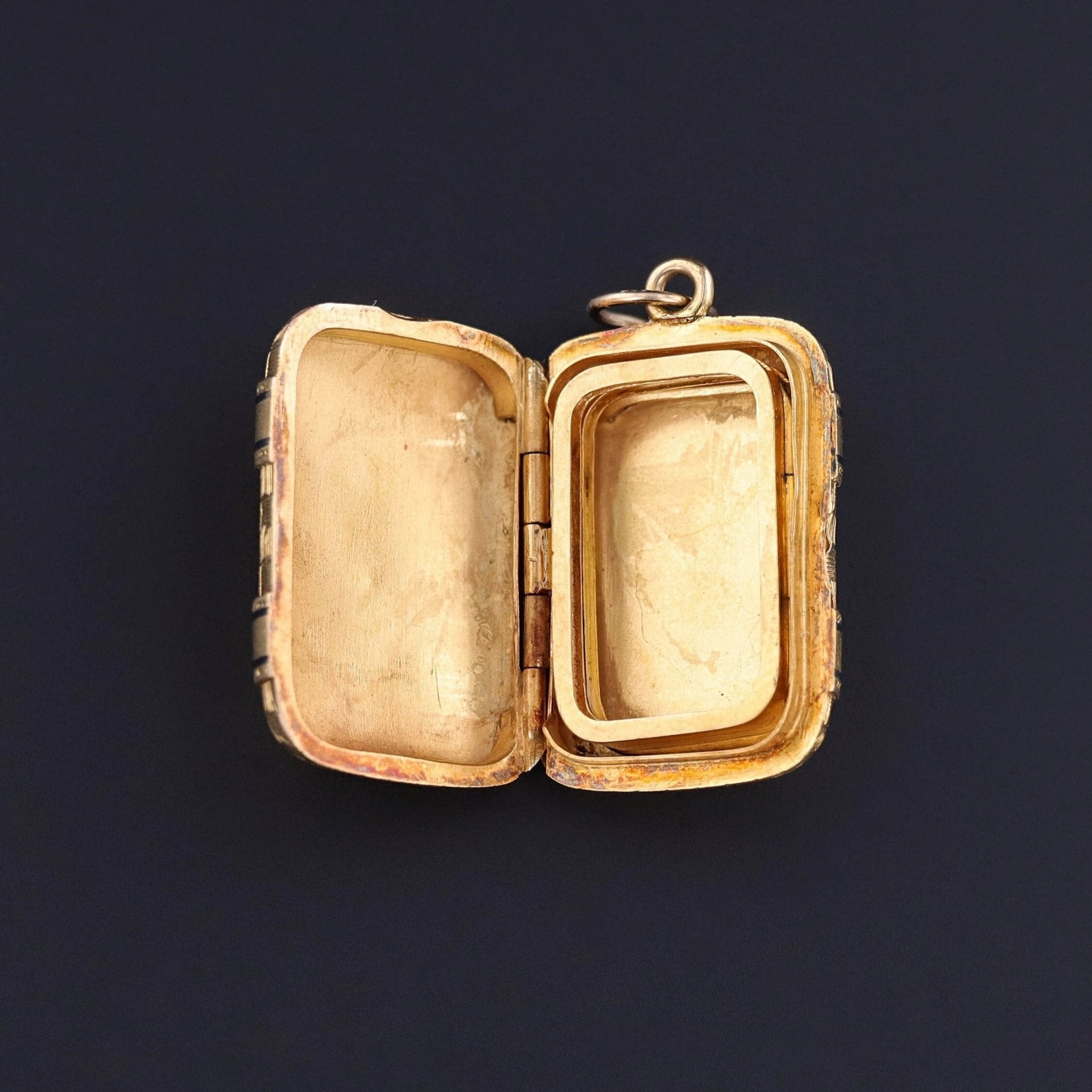 This Victorian era, antique locket (circa 1870-1890) features a suitcase of 18k gold with black enamel buckles.
