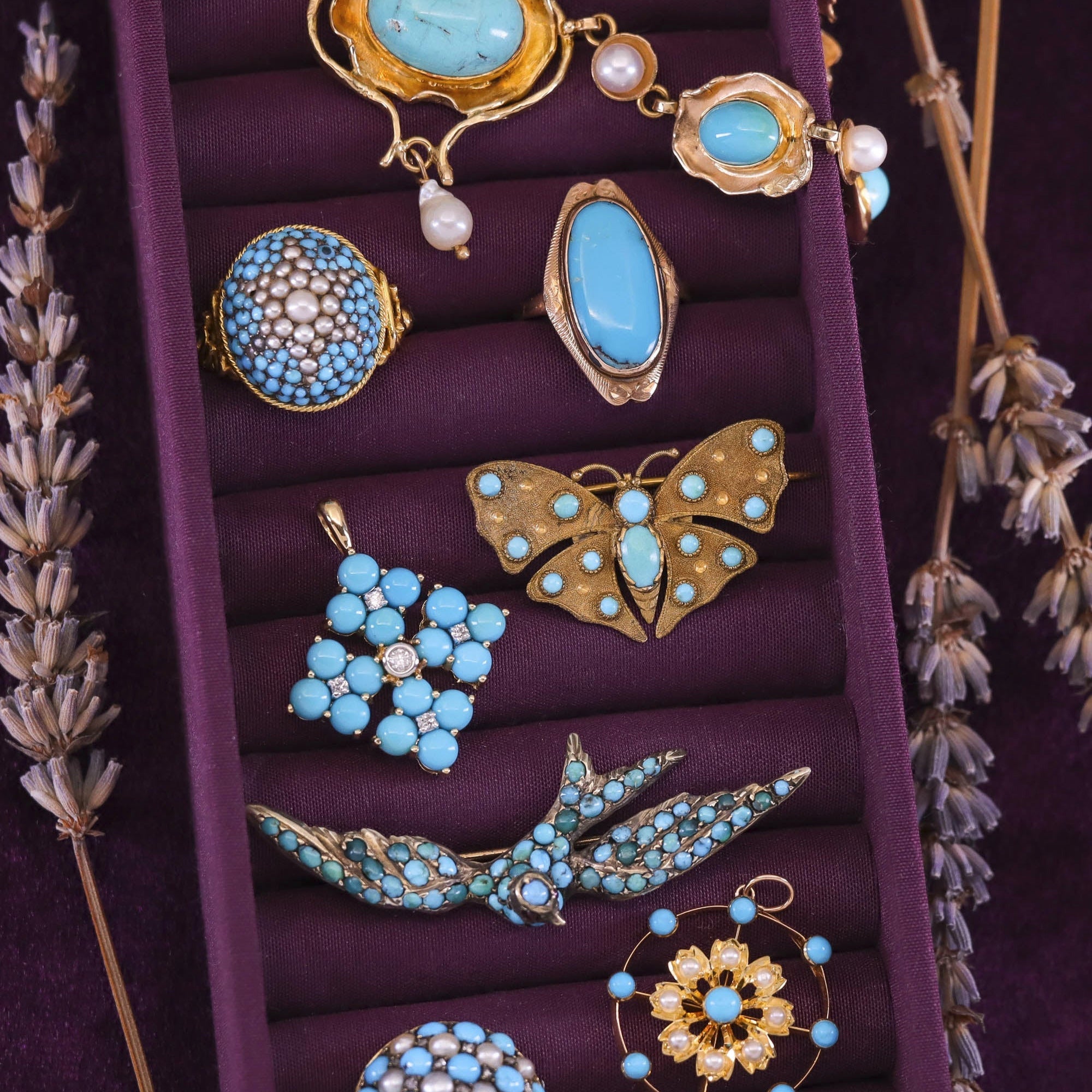 Exquisitely handcrafted in solid 14k gold, the piece is delicately set with vibrant turquoise cabochons, their vivid color providing a striking contrast against the warm glow of the gold. The sculptural form and graceful proportions of the butterfly’s wings showcase the refined artistry of mid-19th-century jewelers, when naturalistic motifs and vibrant gemstones were at the height of fashion.