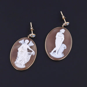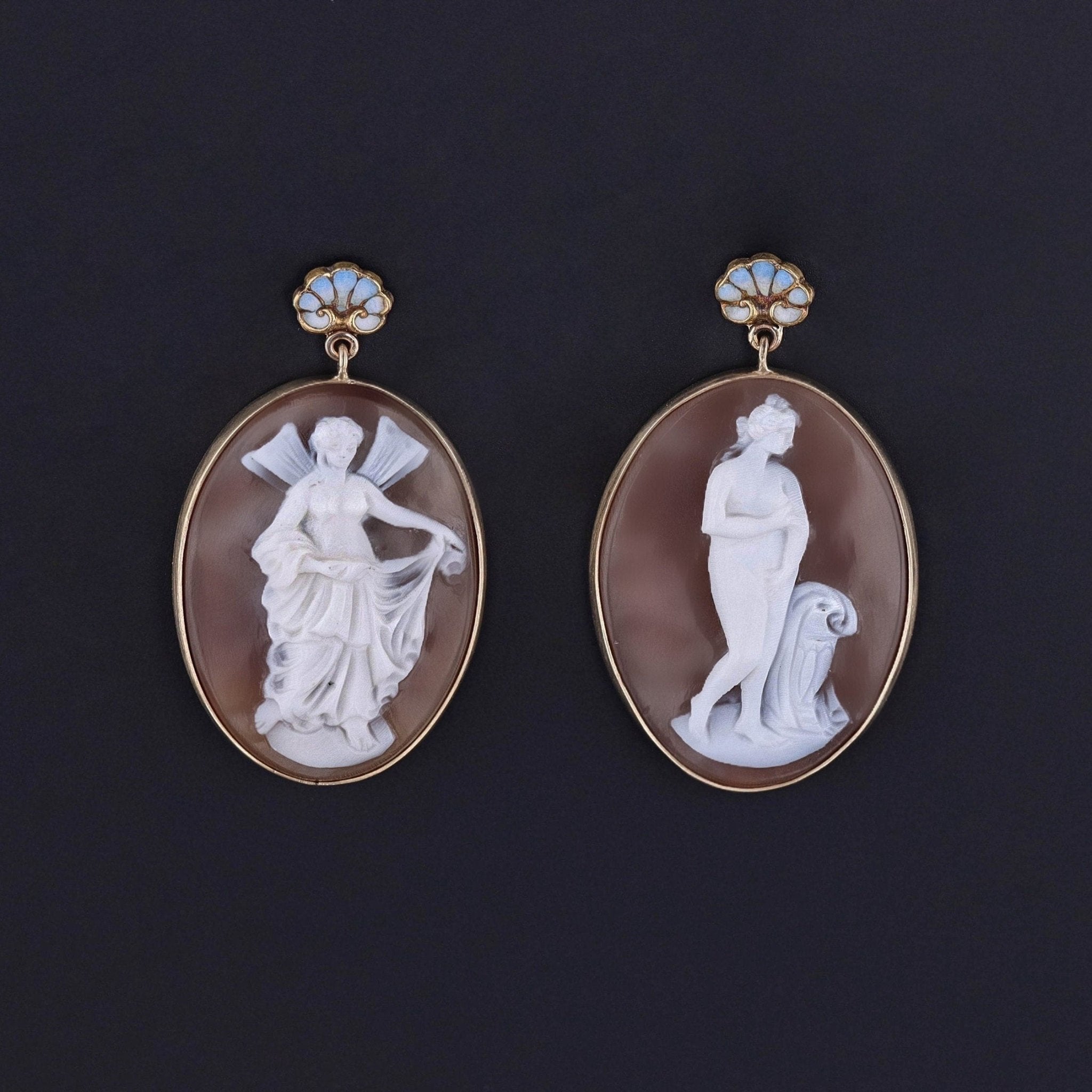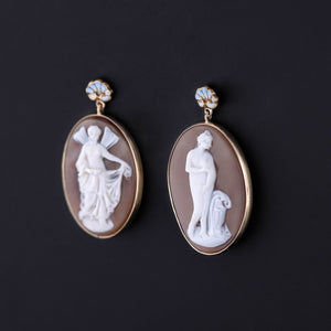 We created these earrings by adding 14k gold enamel surmounts from an antique brooch above antique hand carved shell cameos (circa 1890). One of the cameos depicts Venus, the Roman goddess of love, and the other depicts Psyche, the goddess of the soul who is often depicted with butterfly wings.