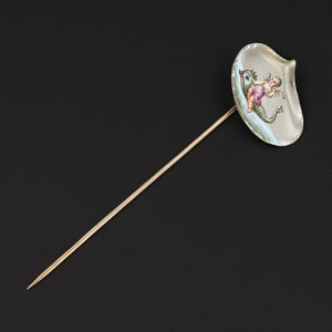 The shell shaped stick pin is enamel over metal and the cherub is hand painted on the front. The pin stem is 14k gold.