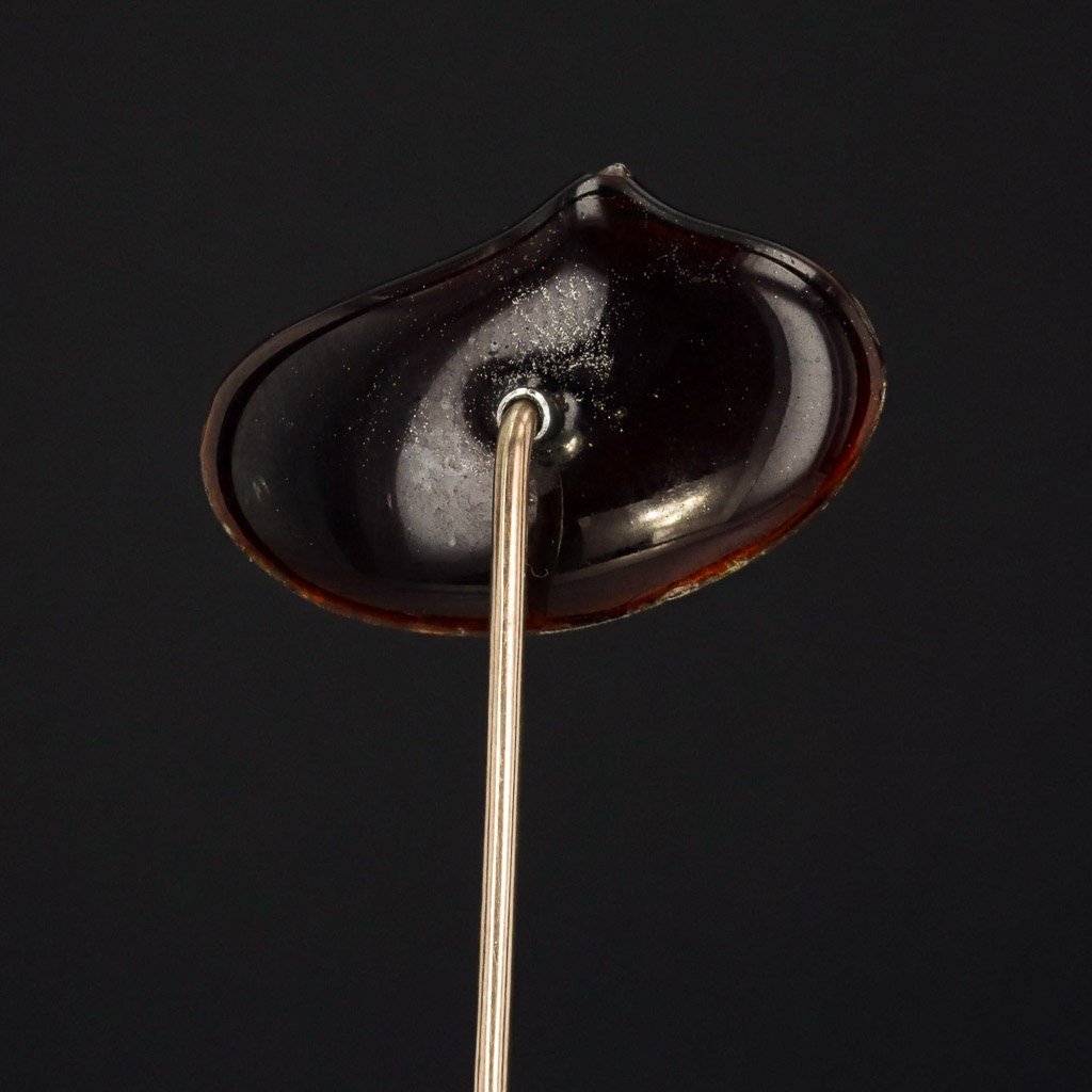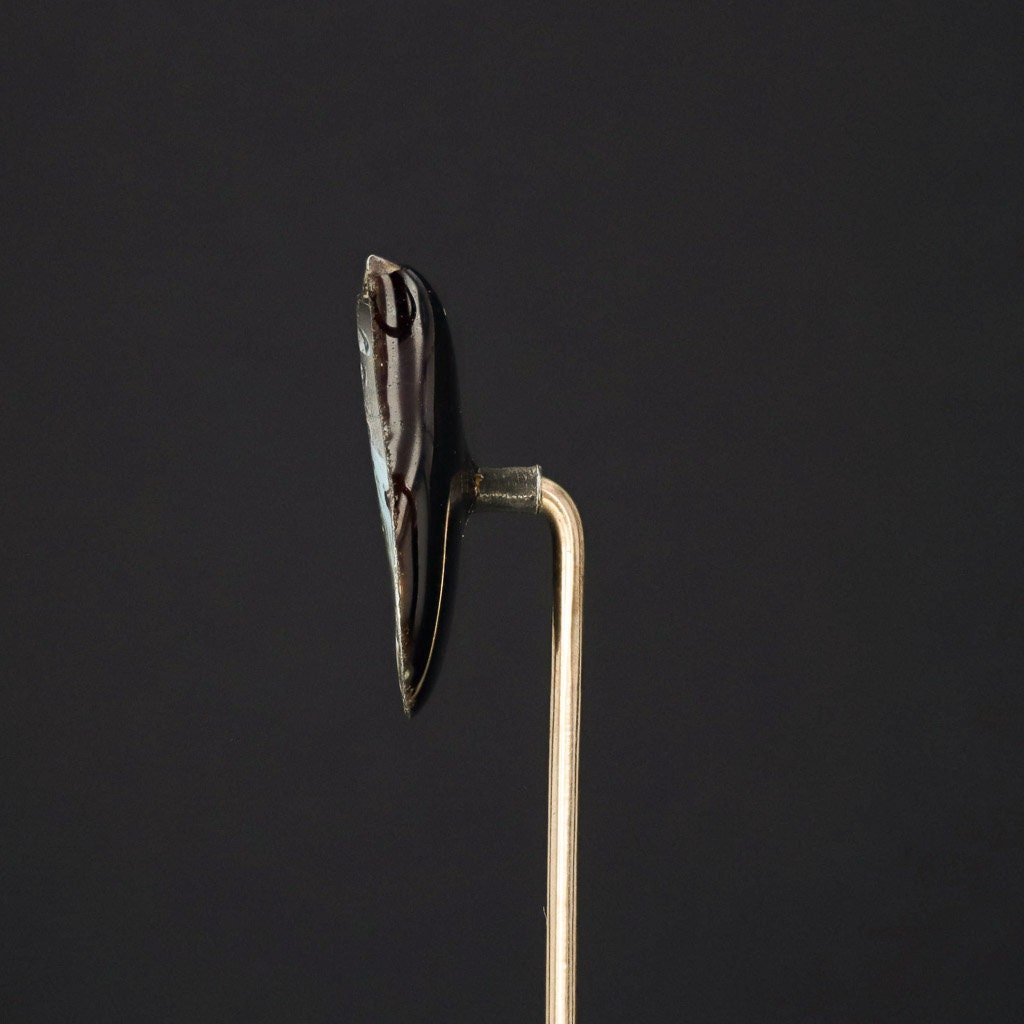The stick pin measures 2.8 inches from top to bottom by 0.9 inches wide. It is in good condition; however, there are some nibbles to the enamel on the periphery of the shell.