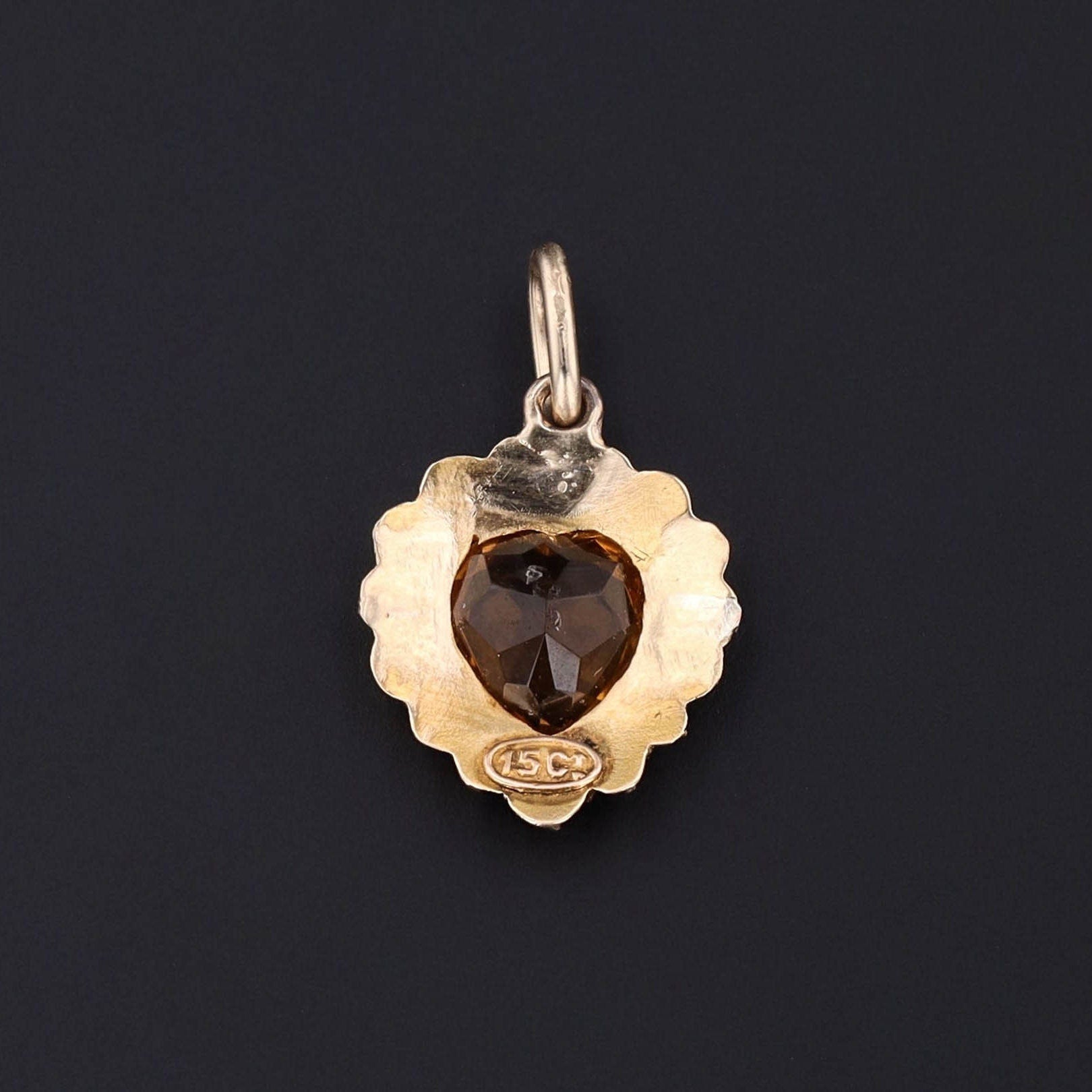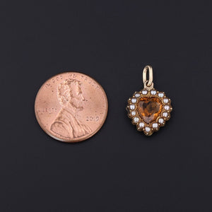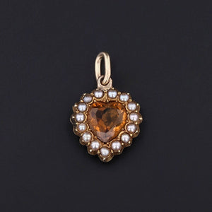 This charm was converted from an antique stick pin (circa 1900) by removing the pin stem and adding a 14k gold gold jump ring bail. The charm features a heart shaped citrine encompassed by a halo of pearls in 15ct gold.