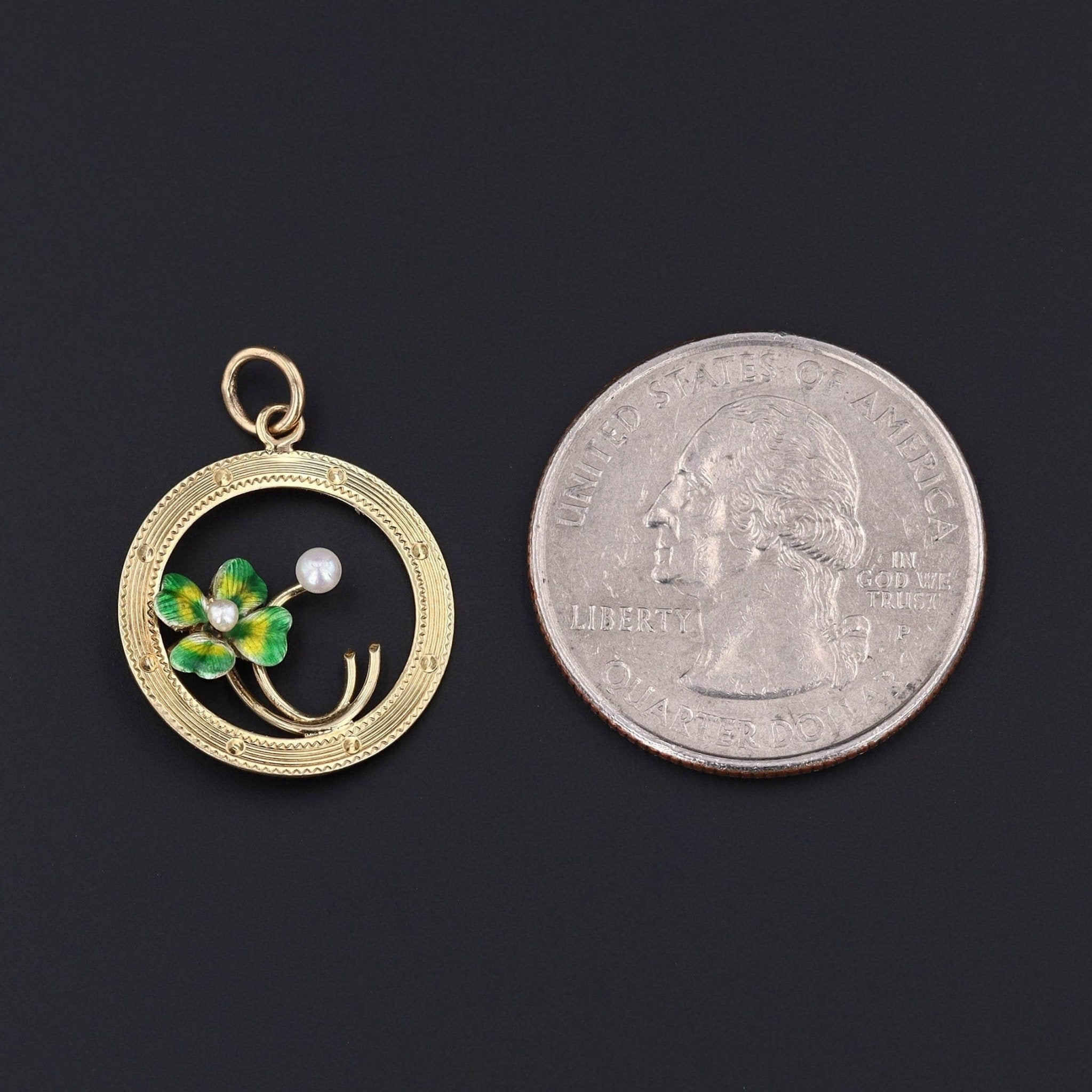 This circular pendant was converted from an antique brooch (circa 1910-1920) and features a green enamel clover and two tiny post set pearls.